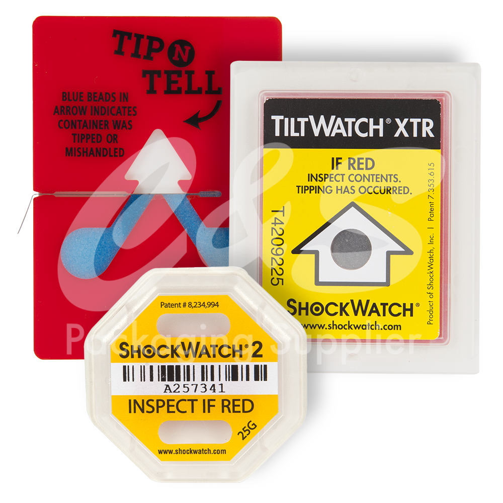 - Tip N Tell: Una vegada col·locat en la mercaderia i extret el passador, l'indicador registrarà l'excés d'inclinació o bolcada tenyint de blau la fletxa inicialment de color blanc. Es subministren amb etiquetes d'avís de fàcil visualització i control per als operaris de transport.