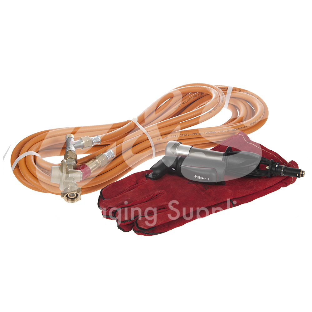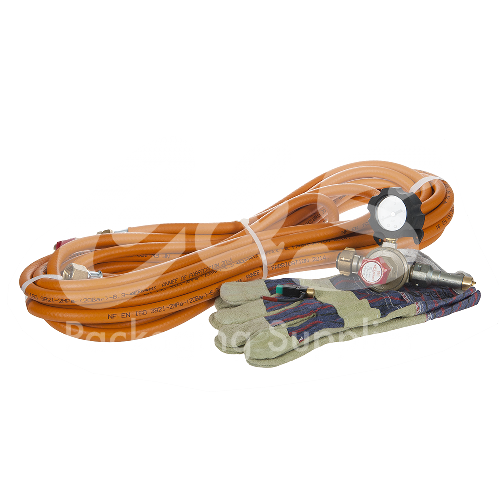CE approved, it comes with a 8-m hose, a regulator fitted with a pressure gauge (1.5 to 3.5 bar), two gloves, a fold-away fixing hook, 360º rotating burner, with automatic start-up for maximum performance, ergonomic synthetic handle and a rapid and rotating power connection.